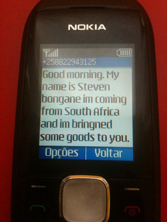 On Tuesday, we received an SMS on the cell number at the JA! office in Maputo. The person called himself Steven Bongane from South Africa and said he was bringing some goods for us. JA’s Program Officer spoke to “Steven” who spoke in English. When asked what he was bringing, he mentioned “air sampler”.