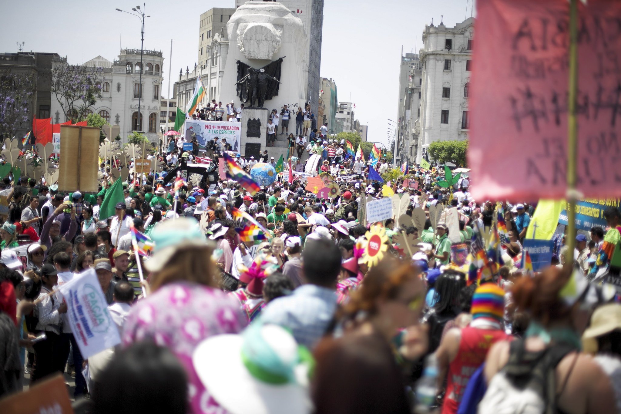 Thousands marching into the historic Plaza San Martin in central Lima, demanding climate justice. Photo credit: Luka Tomac