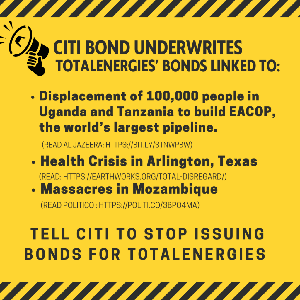 Ranjana Bhandari, director of Liveable Arlington in Arlington, Texas and home to 400,000 residents exposed to Total’s ongoing urban fracking operations stated:  “The ongoing fracking operations of the French energy giant TotalEnergies’ are placing thousands of families and children at risk in the city of Arlington, around Texas, and other locations across the nation and worldwide. It’s time consumers and investors demand American banks such as Citi, JP Morgan, and Bank of America stop funding these long-term bonds that are harming the very residents in the cities where these banks are operating.”